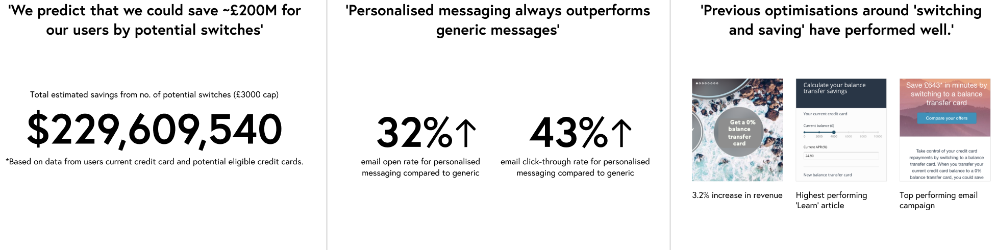 We’ve calculated that we could help save ~£200M across our users if they switched their credit cards to balance transfer cards available in our marketplace.