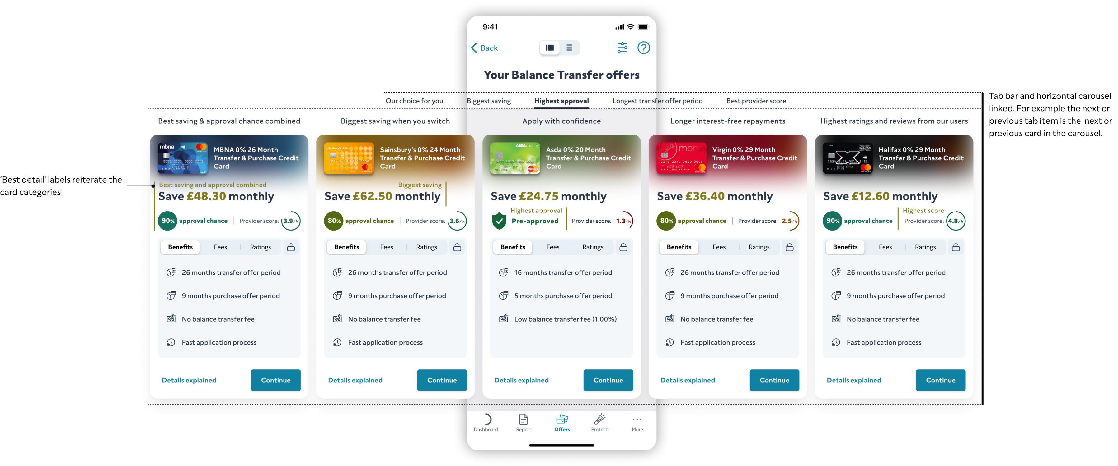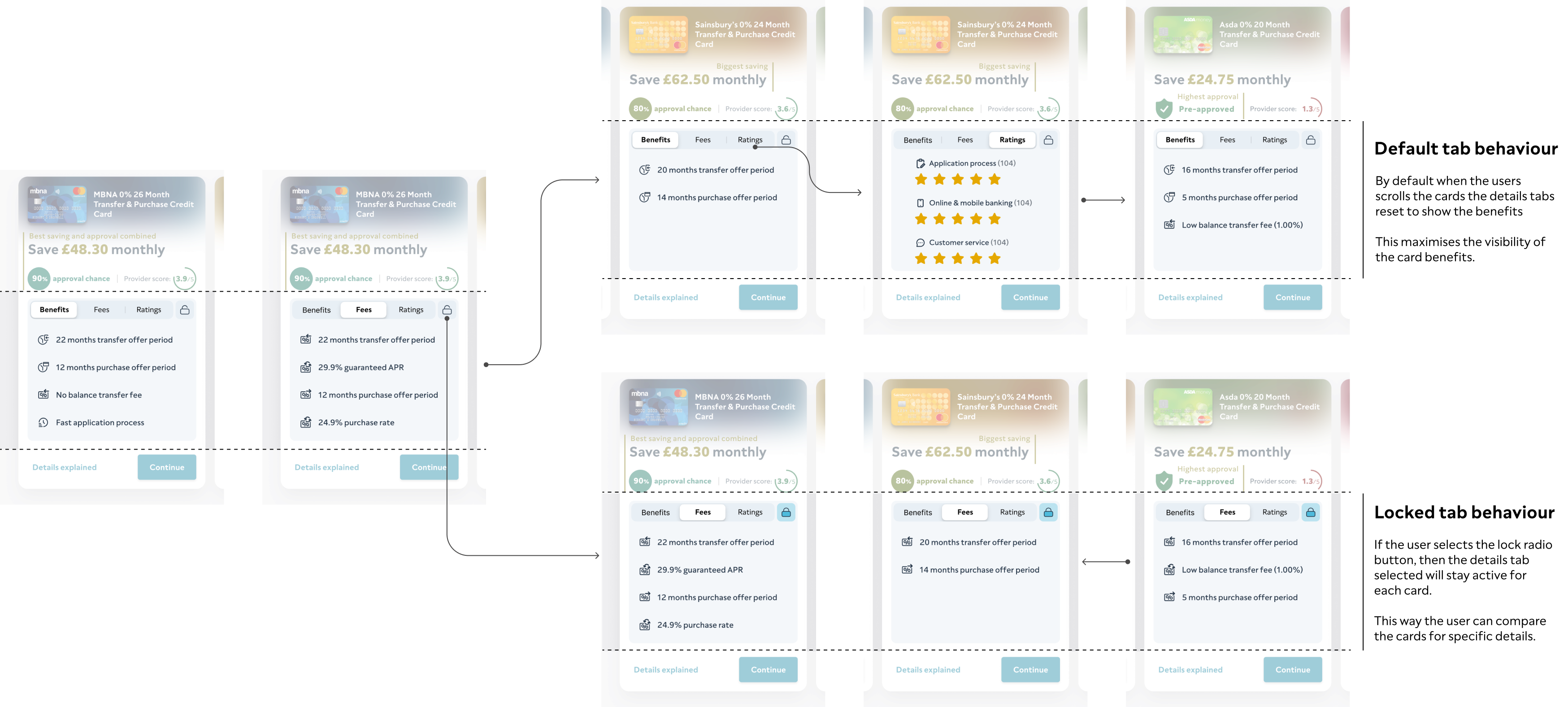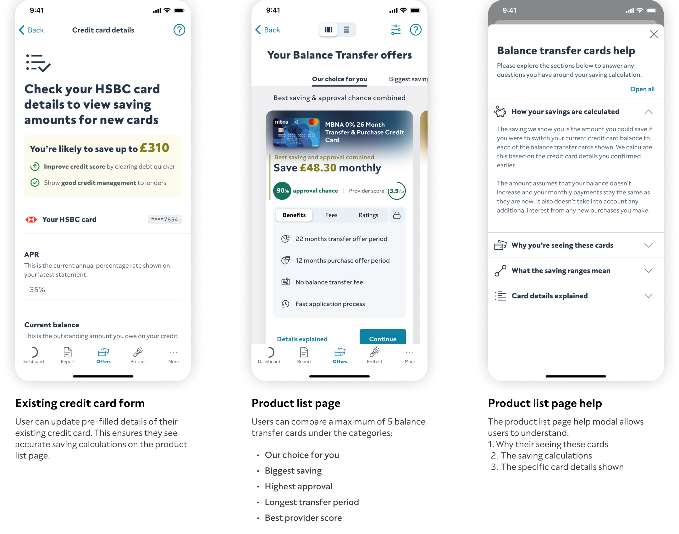 • Show savings for top 1, 3, or all eligible cards. • Include APR, terms, eligibility, example. • Link to product pages.