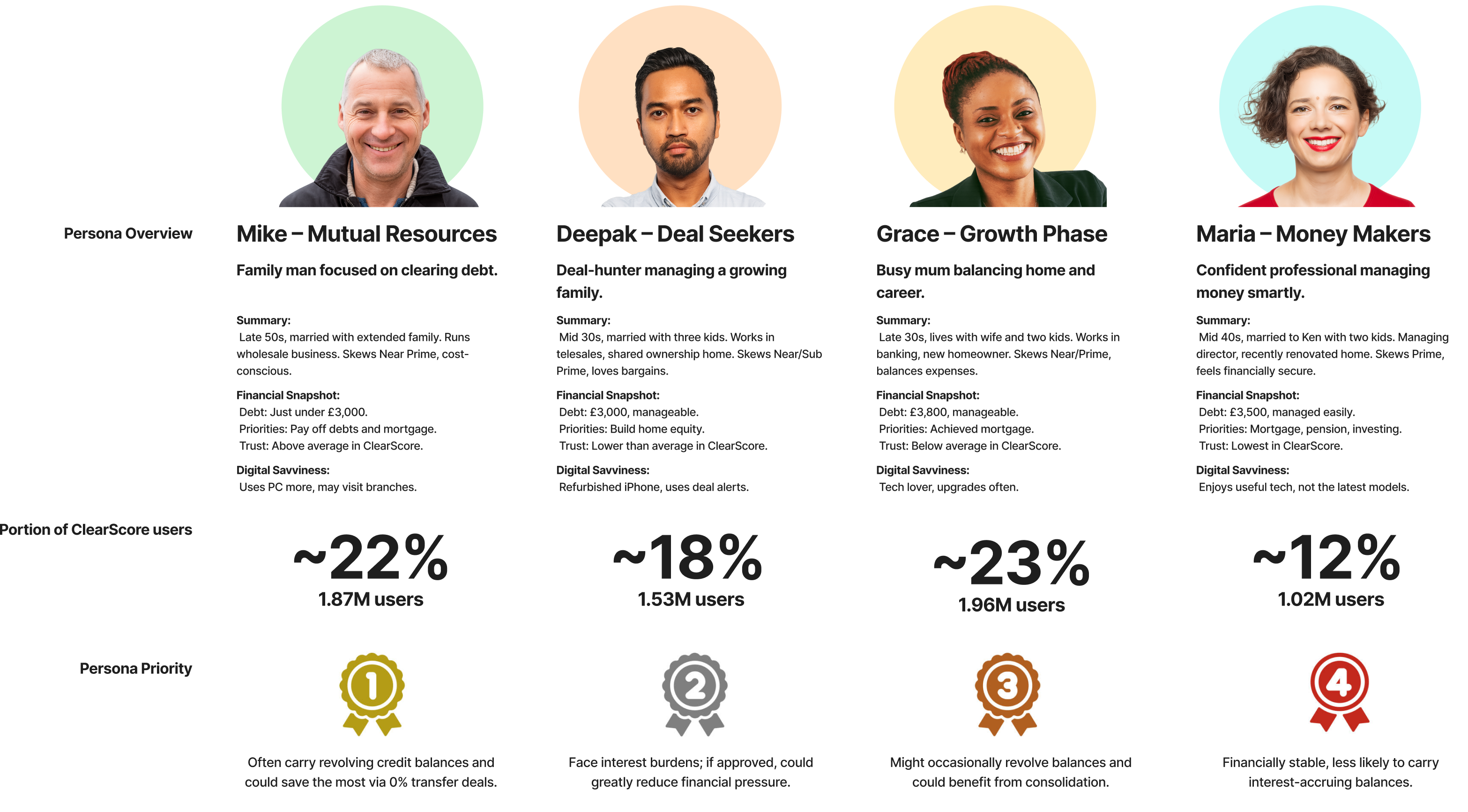 ClearScore has 6 personas — 4 of these are a target audience for this project and described below: